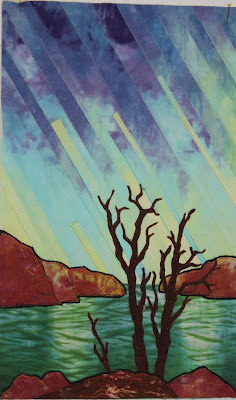 Oh, what fun we had!! My friend Lorraine and I went to Asilomar Conference Center in Pacific Grove, Ca for the Empty Spools seminar last week. WoW!! I had class with Gloria Loughman from Australia, I love her work and have all her books. It was a 5 day class on painted landscapes. We made a sample from her pattern which I'll put at the end of the post. Then we painted sky fabric, mine is dull blue, gray, white, for a moody Oregon seascape. Many of the student works were beautiful sunsets, with bright colors. Cutting the fabric into various widths, from 3/4" to 2". we then rearranged them to get a blend of colors. We could do them vertical, horizontal or diagonal. I chose diagonal to give it a rainy coastal feel. The water is painted in a darker, more intense color, I added some green to the ocean, and painted the fabric dry instead of wet. I wanted it more streaky, not as blended. My design is from a photo I took from the South Jetty beach at Bandon, Oregon. The rock formations are very distinctive to me, and brings back many good memories of trips with my husband. The second photos of the trees on the rocks is from Bastendorf beach, I added a few trees to my design, but haven't made them yet. I worked hard on the sketch, especially the "pointy" middle rock. Trying to make it skinnier, shorter, chunks out of the side, anything to make it look less phallic. I finally decided to make it gray and hope it would fade into the background more. ha ha ha. Gloria's technique adds a black edge to each section of rock, put together with Steam a Seam 2, then on black fabric and trimmed to 1/8". I did NOT like the Steam a Seam, it is too sticky, and thick, two layers was ok to stitch through, but more, like the rocks, and my needle gummed up, and my thread broke. I need a stronger thread too. It also gummed up our scissors and rotary cutters, and my needle threader on the sewing machine is screwed up too. So far, so good, I added some sand fabrics and some cheesecloth at the bottom. I have more stitching to do on the cheesecloth and more to add at the bottom edge of all the rocks. Also some waves splashing up. The bits of white will add a much needed brightness to the design. I've also started adding some trees to the top left rocks and a single stunted tree on the big rock in the water. I can't wait to get this finished. My practice piece with a fat quarter of Gloria's hand dyed fabric, we picked the piece from a brown paper bag, so could not choose the colors we liked. The ocean area is a bit of green hand dyed shibori fabric I brought with me. I made a second piece while I waited for people to catch up. I thought I would do my Bandon seascape with a horizontal background, so wanted to play with that orientation. I will add a larger rock to the bottom right and some sailboats to the water. This pic is all the student practice pieces, while we learned her technique. Notice the horizontal, vertical and diagonals. Also, the man in class had to be different and added a palm tree to his, he was from Hawaii. My friend made this beetle in Susan Carlson's class. I will not post anymore student work, as many people were picky about people taking pics of their work. We had a fabulous time. The beach was beautiful, the food great, and we toured all the class rooms at the end of the week. Seeing all the fabulous work was fascinating, and being able to talk to all the teachers. I will definitely use this technique again, it adds a lot of interest to what could be a boring piece of blue sky. The wildflowers on the dunes were in full bloom. I will be linking this to Nina Marie's "Off the Wall Friday" click here see what other talented textile artists are doing this week.